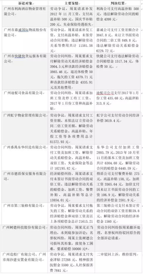 更讓張先生詫異的是,他們在應訴后,代理律師在中國裁判文書網檢索后發現,這不是周某第一次因為勞動糾紛將企業告上法庭。從2012年至今,在7年的時間里,周某已將包括張先生所在的11家企業提起仲裁,上訴理由多是未簽勞動合同、違規解除勞動關系、拖欠工資等,要求賠償雙倍工資和各項費用。
