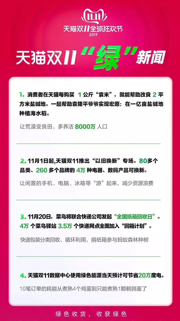 2019天貓雙11全球狂歡節(jié)啟動(dòng)發(fā)布會(huì)上,天貓總裁、淘寶總裁蔣凡表示,把11月20日設(shè)為“全國(guó)紙箱回收日”,號(hào)召全社會(huì)一起回收紙箱、包裝物,加入綠色收貨行動(dòng)。