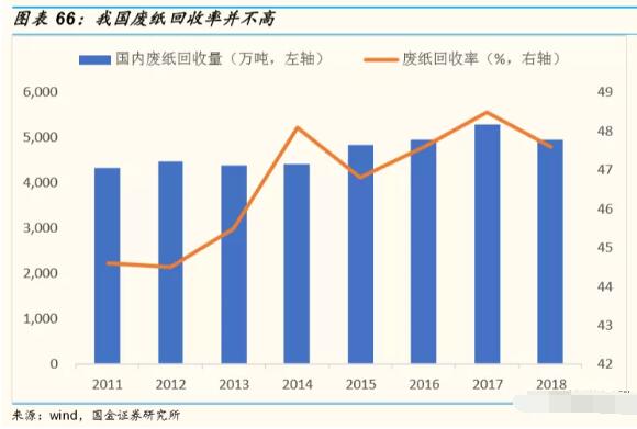 廢紙進口量銳減,我國的廢紙回收率不高,導致原材料持續收緊,這將觸發包裝紙價格走強。
