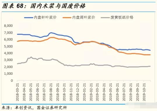 2)木漿造紙:目前來看,無論是國內漿價還是國際漿價都處在相對低位。但與廢紙相比木漿價格明顯更高。若采用木漿進行包裝紙制造,在激發木漿需求的同時,也將會導致成本增加促使原紙漲價。