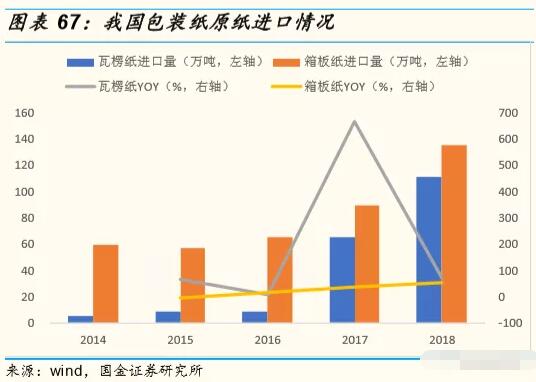 1)直接進口成品紙:2018年,國內進口瓦楞紙和箱板紙數量分別為 111.12萬噸和135.39萬噸,同比增長71.32%和51.03%。原紙進口增長雖快,但絕對體量相對較小,與全國每年近5000萬噸的包裝紙需求相比,進口包裝紙原紙短期內較難形成補償。