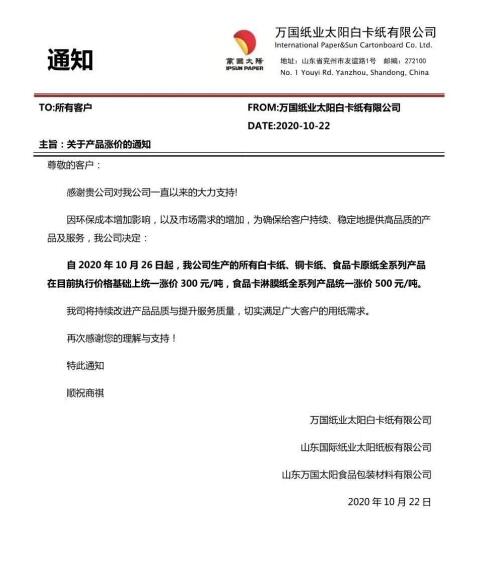 萬國太陽:10月26日起,公司生產的所有白卡紙、銅卡紙、食品卡原紙全系列產品在目前執行價格基礎上統一漲價300元/噸,食品卡淋膜紙全系列產品統一漲價500元/噸。