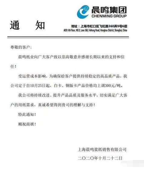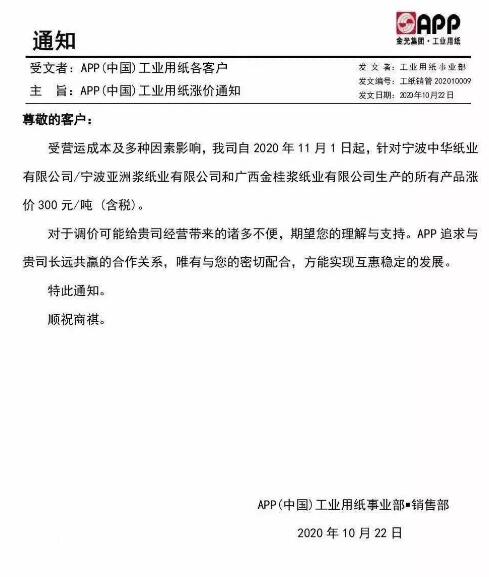 APP:11月1日起,針對寧波中華紙業有限公司/寧波亞洲漿紙業有限公司和廣西金桂漿紙業有限公司生產的所有產品漲價300元/噸。