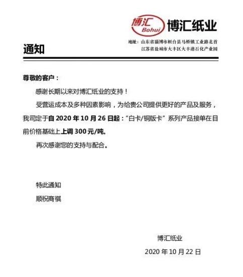 博匯紙業:10月26日起,白卡/銅版卡系列產品接單在目前價格基礎上上調300元/噸。