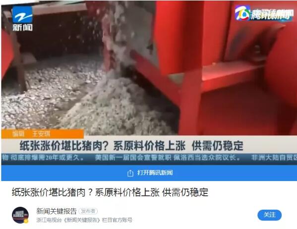 小編根據關鍵詞查找了一番,很快找到了浙江電視臺的《紙張漲價堪比豬肉?系原料價格上漲 供需仍穩定》。