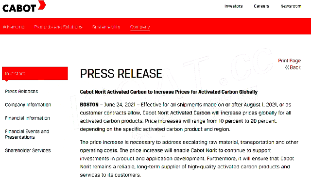【卡博特活性炭漲價】8月1日起,卡博特諾芮特活性炭公司將在全球范圍內提高所有活性炭產品的價格,漲幅在10%-20%之間。