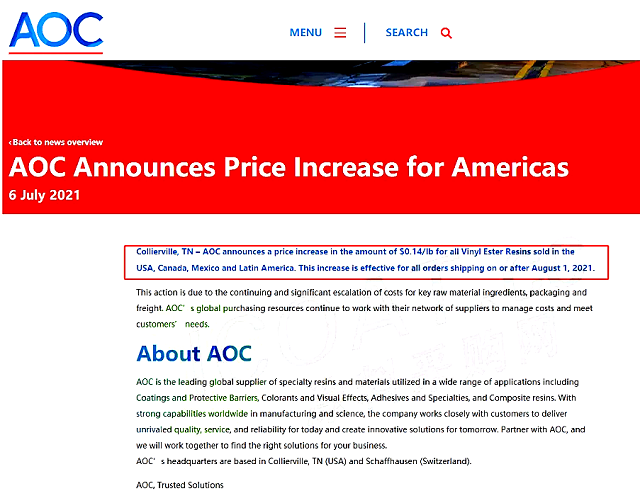 【力聯思(AOC)乙烯基酯樹脂漲價】8月1日起,所有等級乙烯基酯樹脂在美洲地區的價格將提高0.14美元/磅(約1985元/噸)。