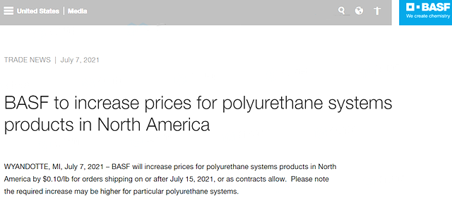 【巴斯夫聚氨酯漲價】7月7日,巴斯夫宣布將對2021年7月15日或之后發貨的北美聚氨酯系列產品的價格提高0.10美元/磅(約合人民幣1418元/噸),這是巴斯夫繼7月1日,7月10日以來的第三次提價。