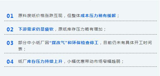 本周瓦楞紙、箱板紙市場價格整體持穩運行,一方面是龍頭紙企庫存較低,堅挺價格,有助于整體行情波動不大;另一方面,廢紙市場弱勢下跌及下游需求遲遲不見好轉,紙廠庫存壓力持續上升,小幅優惠帶動市場窄幅趨弱。預計未來一周,供需兩端無較強影響因素,瓦楞箱板紙市場行情變化不大。由于廣東煤改氣政策影響,預計短期瓦楞及箱板紙市場弱穩運行,部分紙企價格或有小幅震蕩。