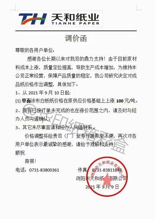 繼8月30日玖龍天津、重慶基地上調白板紙出廠價格50元/噸后,9月8日玖龍東莞、太倉基地上調白板紙出廠價格50元/噸。