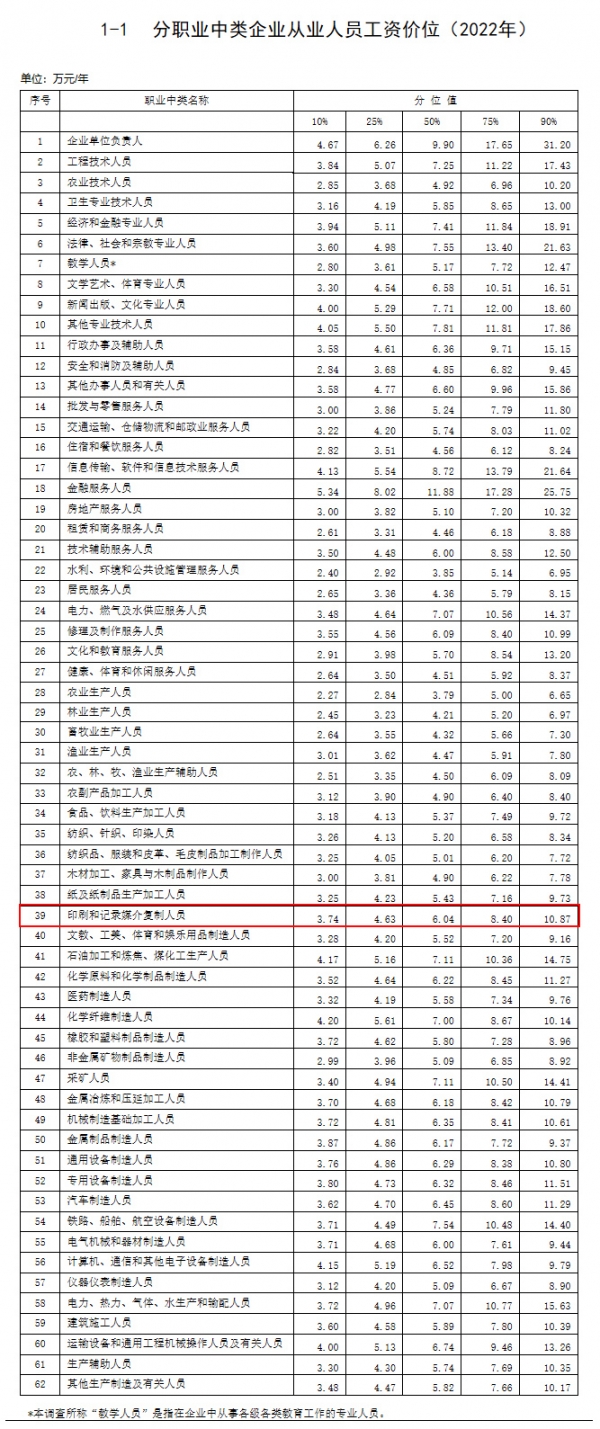 數(shù)據(jù)顯示,“印刷和記錄媒介復(fù)制人員”工資價(jià)位分別為3.74萬(wàn)元(10分位)、4.63萬(wàn)元(25分位)、6.04萬(wàn)元(50分位)、8.40萬(wàn)元(75分位)、10.87萬(wàn)元(90分位)。